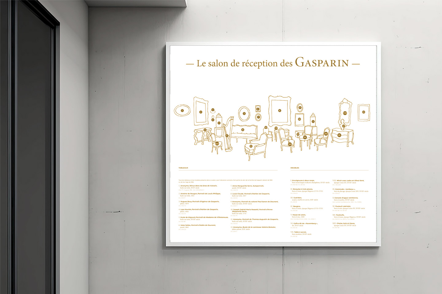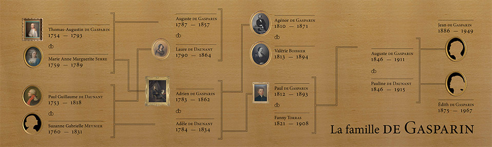 Frise généalogique de la famille « De Gasparin » pour le salon avec cartel silhouettes des mobiliers et objets.